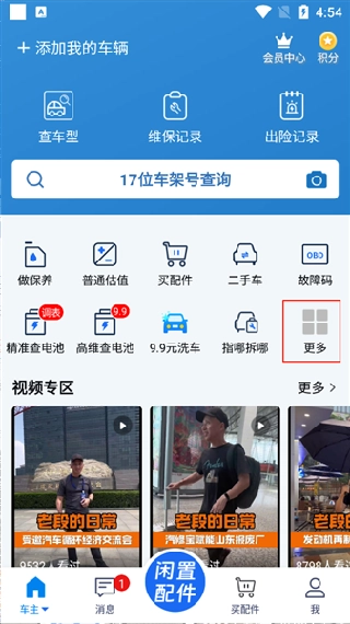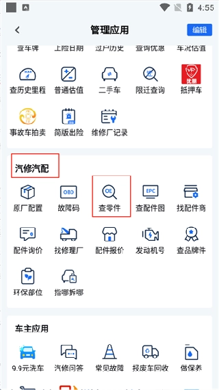 2、找到【汽修汽配】板块,随后点击查零件选项。