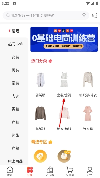 2、进入分类页面后,在【热门分类】板块里找到【套装/套裙】这一选项,点击它就能进入对应的商品列表页面。