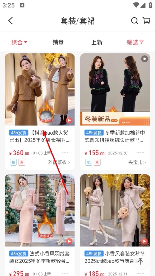 3、进入【套装/套裙】商品列表页面后,能够浏览到多款套装类商品,挑选出自己喜欢的商品并点击进入其详情页查看具体信息。