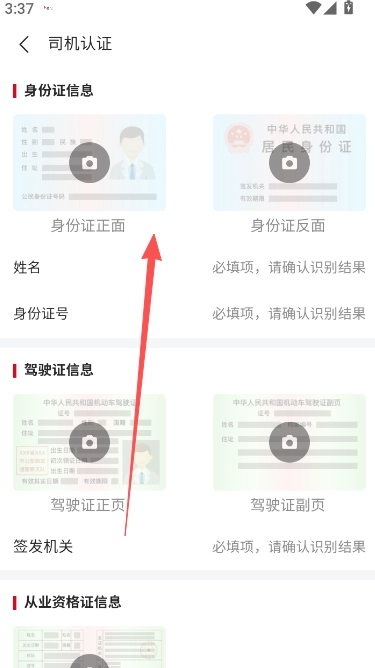 2、上传身份证明、驾驶证信息以及从业资格信息等相关证明材料。