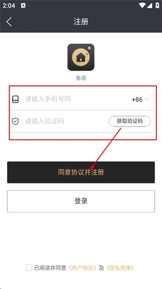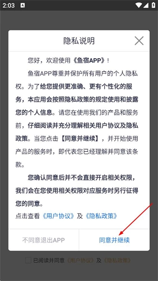 勾选“已阅读并同意”选项后,点击“同意并继续”按钮,即可进入鱼宿的登录界面。