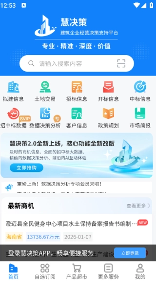 2. 进入首页就能看到拟建信息、土地交易、招标信息等功能板块。