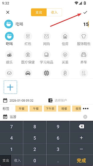 2、提供了多样的收支分类选项,支持添加图片,输入金额和备注后点击完成即可。
