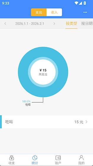 3、在统计界面能按类型、日期查看收支总和