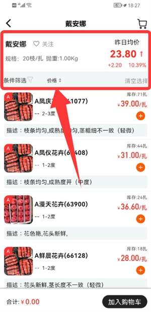 1、进入交易大厅后,找到对应的花材分类进行选择,然后点击需要的花品种类,即可查看其详细信息。