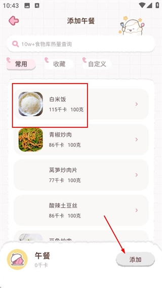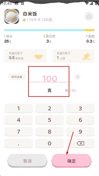 在添加午餐的页面里,先选定想要的食物,接着就能进入该食物的重量设置界面。