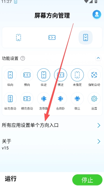1、点击屏幕方向管理所有应用设置单个方向入口打开。