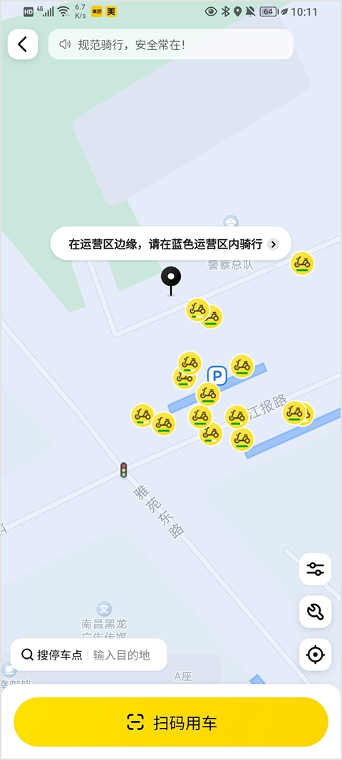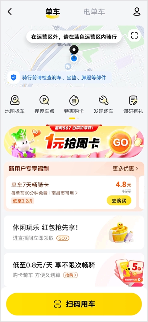 最后在地图中找到附近车辆位置后扫码即可进行骑行