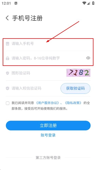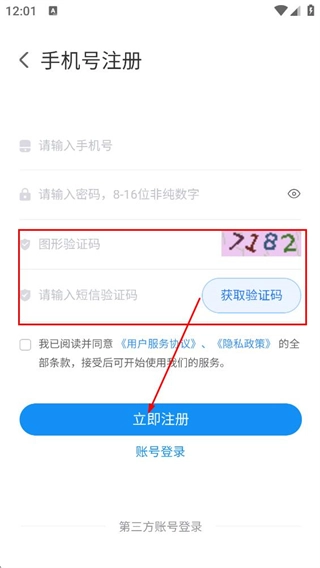 先输入图形验证码,再填写收到的短信验证码,之后点击立即注册按钮,就能完成账号注册的操作。
