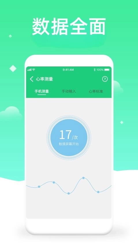 心率测量方面,既支持通过手机直接测量,也允许手动在手机上输入数据,并且还提供了心率标准作为参考依据。