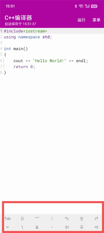 打开C++编译器手机版后,就能直接在手机上编写代码了。代码写完点击运行,就能完成编译组建和运行操作。