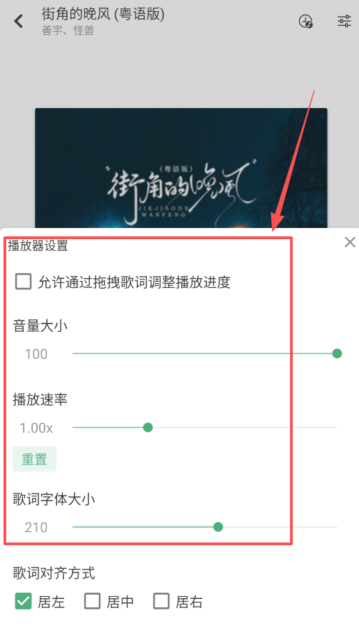 播放歌曲时,在此处可以开启歌词拖拽调整进度、调节音量和播放速度,还能放大歌词字体或更改对齐方式。