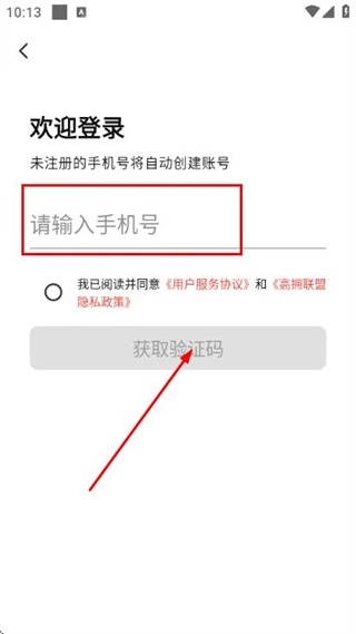 在手机验证登录界面输入手机号,勾选相关协议后,点击获取验证码按钮。