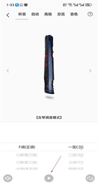 打开软件后,进入听音界面,查看古琴调音模式以及调式选项,点击播放按钮进行调音准备。