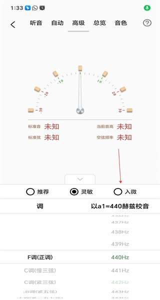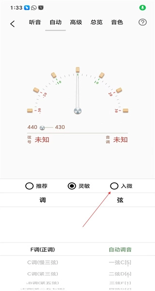 切换至自动页面,查看调音表盘上的显示内容,挑选适宜的灵敏度选项,随后点击自动调音按钮来完成调音操作。