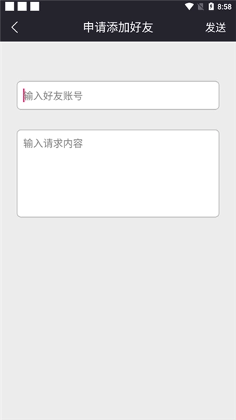 6. 远程模式操作步骤:点击界面右上角的“+”按钮,输入好友的账号(即用户名)以及添加请求的内容,随后点击“发送”。待好友通过验证请求后,该好友就会出现在你的好友列表里。在与好友聊天的过程中,可使用多种功能,比如文字消息、图片发送、语音通话、振动提醒、远程控制功能以及音视频通话等。