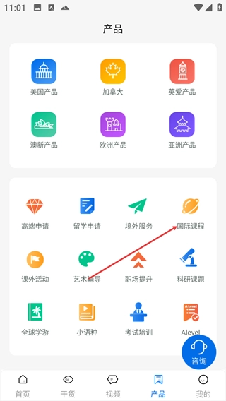 2、进入产品页面后,点击【国际课程】选项。