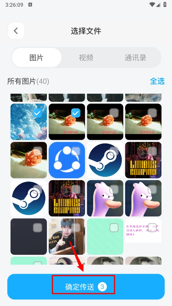 在文件列表里,选中你打算传输的照片、视频和通讯录,然后点击“确定传输”按钮。