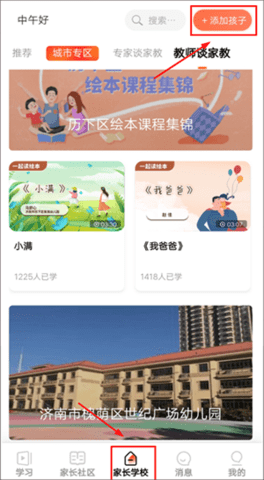 进入家长空间后,家长可在【家长学校】板块,点击右上角的【添加孩子】按钮,输入班级码,即可加入班级家长群。