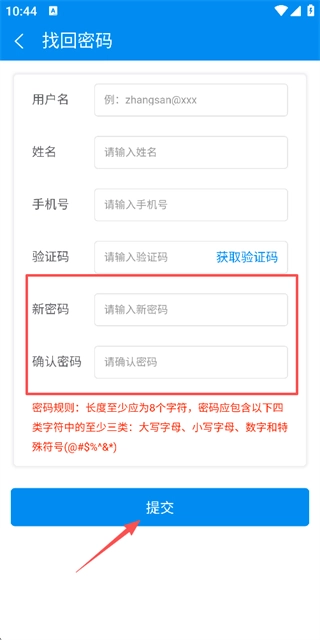 3、在找回密码页面填写新密码与确认密码后,点击提交按钮完成密码重置操作。