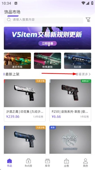 在饰品市场首页,点击“最新上架”右侧的“查看更多”按钮,即可进入饰品列表页面。