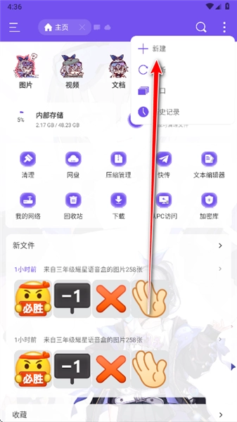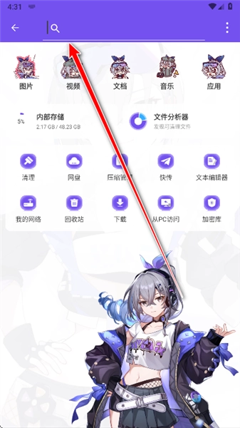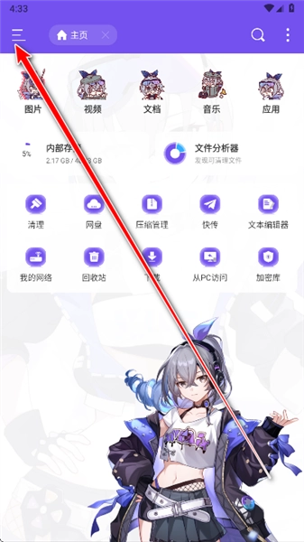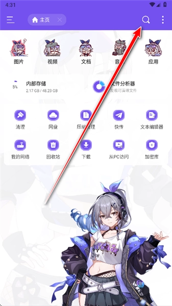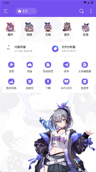 1.打开ES银狼版,可以看到,软件的风格都变成了二次元的风格,首页主要有网盘、压缩管理、文本编辑器、加密库等等功能。