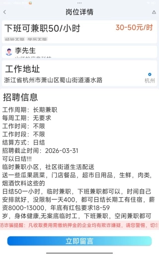 2、在岗位详情页面能查看各类不同岗位的信息,并且可以随时进行留言操作。