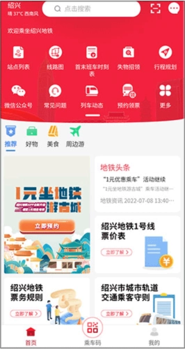 绍兴市轨道交通为本地市民提供了更便捷的扫码乘车服务,市民可一键查看地铁路线图,随时知晓乘车优惠活动,从而享受更舒适的地铁出行体验。