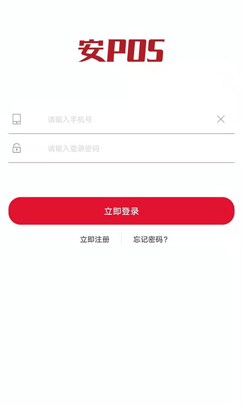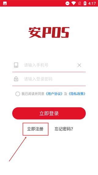 在【安POS】的登录页面,如果还没有账号,点击【立即注册】按钮,就能进入账号注册的流程。