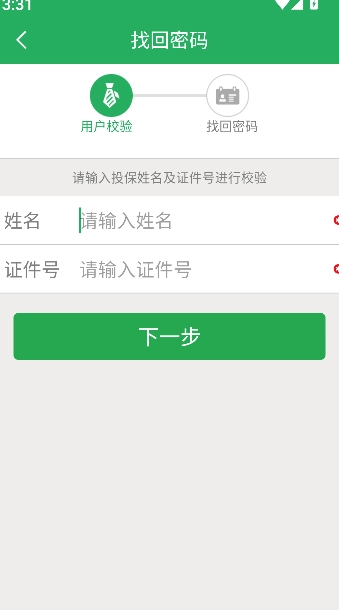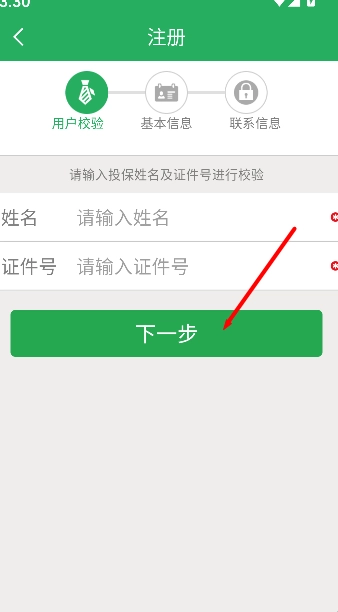 请输入您的姓名和证件号码,仔细核对信息无误后,点击“下一步”按钮即可完成注册流程。