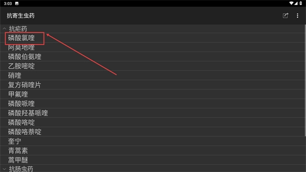 在抗寄生虫药的细分列表里,找到并点击【磷酸氯喹】,就能进入该药物的详情页面。