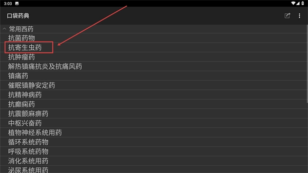 在常用西药的子分类中,点击【抗寄生虫药】这一选项,即可查看该类别下包含的具体药物条目。
