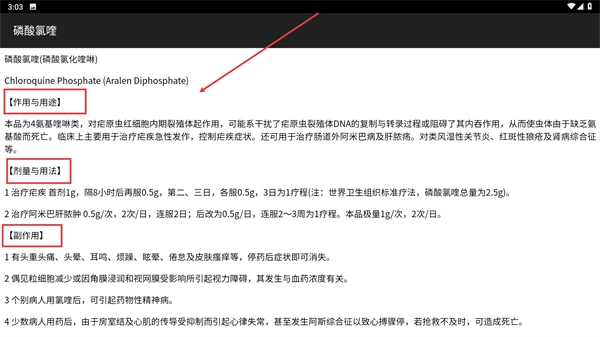 在磷酸氯喹的详情页面中,能够查看它的【作用与用途】【剂量与用法】【副作用】等相关信息,从而了解这款药物在临床方面的内容。