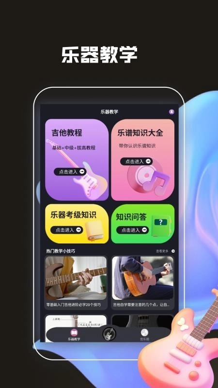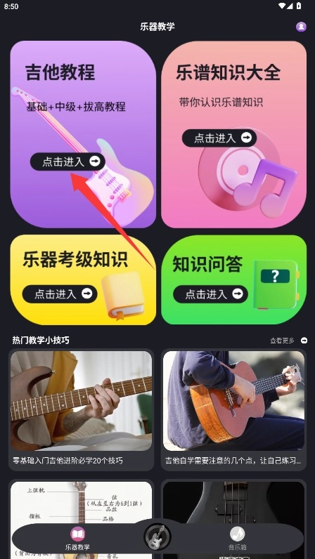在主页面能够浏览吉他教程以及乐谱知识大全等内容,点击吉他教程即可进入教学专区。