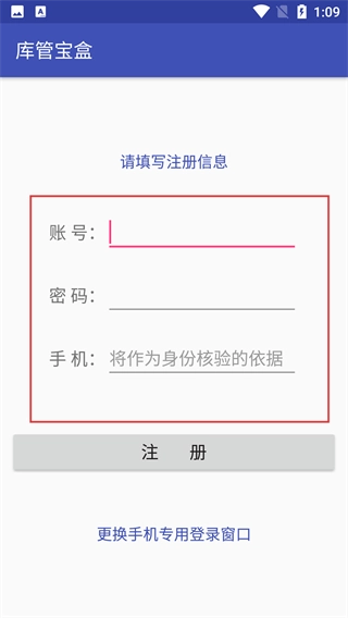 在【库管宝盒】的注册页面,按顺序填写【账号】、【密码】和【手机】这几项信息,全部填写好之后,点击【注册】按钮来提交这些信息。