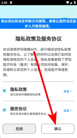 在梦阳健康页面完成勾选操作后,点击确认按钮,即可进入登录页面。