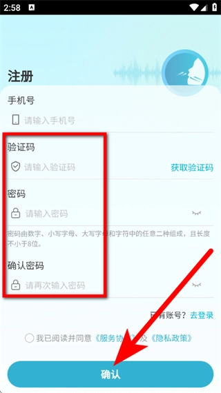 在输入验证码、设置密码并勾选相关协议后,点击确认按钮,即可完成注册流程。