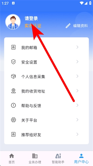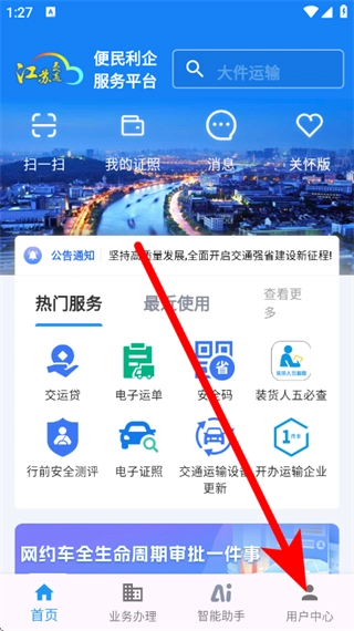 在江苏交通云页面,点击底部的用户中心选项,即可进入用户中心页面。