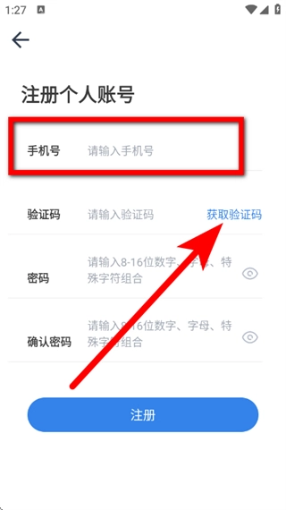 在个人账号注册页面,填写手机号后,点击“获取验证码”按钮。