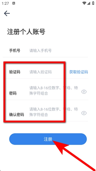 在输入框中输入验证码,设置好密码后点击注册按钮,即可完成个人账号的注册流程。