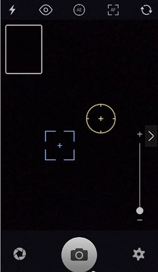 打开应用后,顶部从左到右依次排列着闪光灯控制、效果预览、自动曝光、自动对焦以及前后镜头切换这些功能。