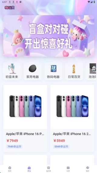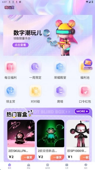 首页设有每日福利、口令红包等板块,同时也能浏览到热门盲盒。