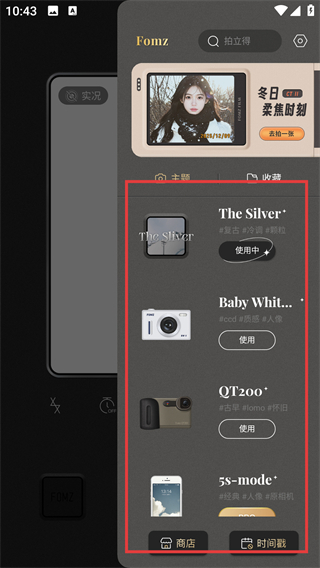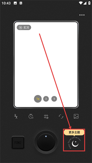 1、在相机界面点击【更多主题】按钮,即可打开主题选择面板,浏览各类相机风格主题。