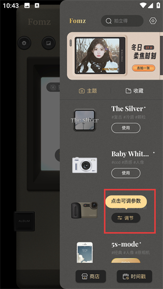 3、选定主题后,点击它下方的【调节】按钮,即可打开该主题对应的参数调整面板,进而自定义拍摄效果。