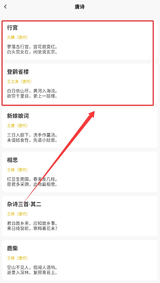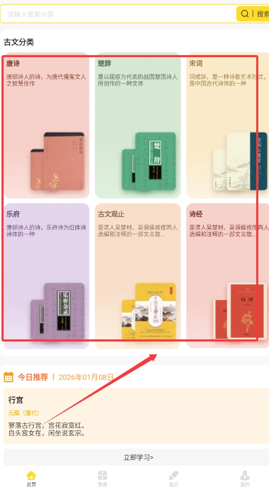 1、首页的搜索框与彩色分类方块可助你迅速定位想查看的诗词类别,例如直接点击“唐诗”就能浏览经典作品的列表啦。