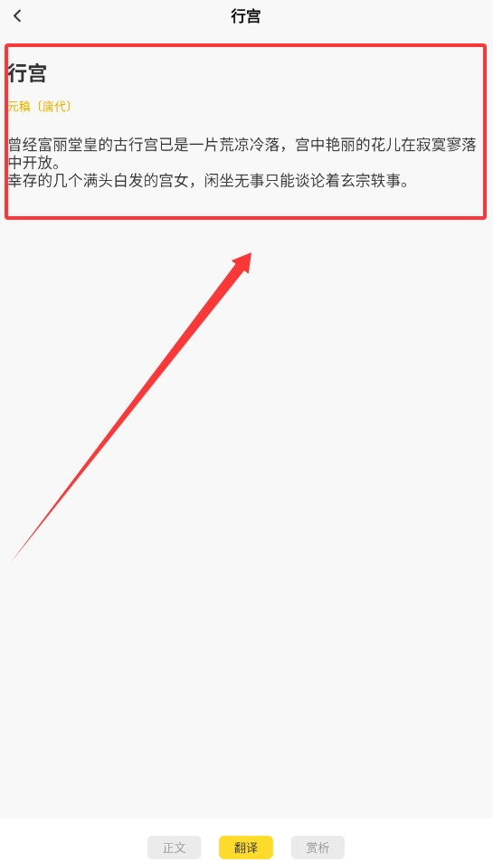 2、遇到心仪的诗作,像《行宫》这类,点击进入就能看到原文与通俗译文,页面底部还设有赏析按钮,方便大家进一步深入学习。