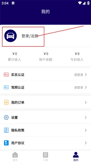 在“我的”页面,点击【登录/注册】入口;此页面还设有实名认证、驾照认证等功能,可用于完善服务所需的个人资质信息。
