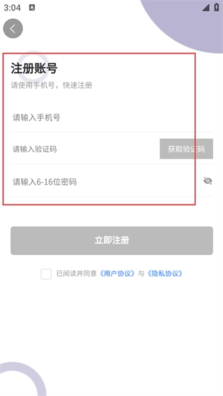 在账号注册页面,按顺序填写【请输入手机号】,点击【获取验证码】并填写收到的验证码,设置好密码后,点击【立即注册】即可完成注册流程。