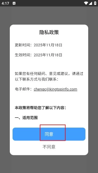 当出现隐私政策弹窗时,先仔细阅读政策内容,之后点击【同意】按钮,即可进入应用的地图主界面。
