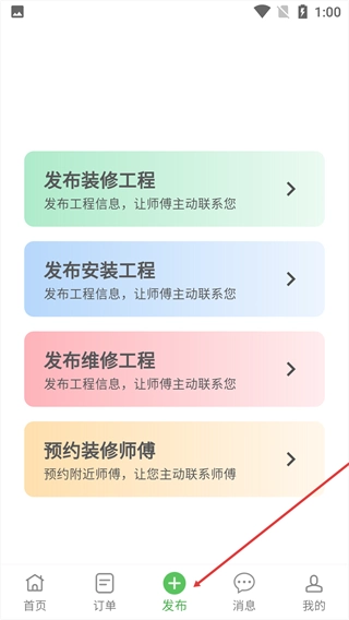 在发布页面点击【预约装修师傅】的选项,即可进入师傅预约的界面。
